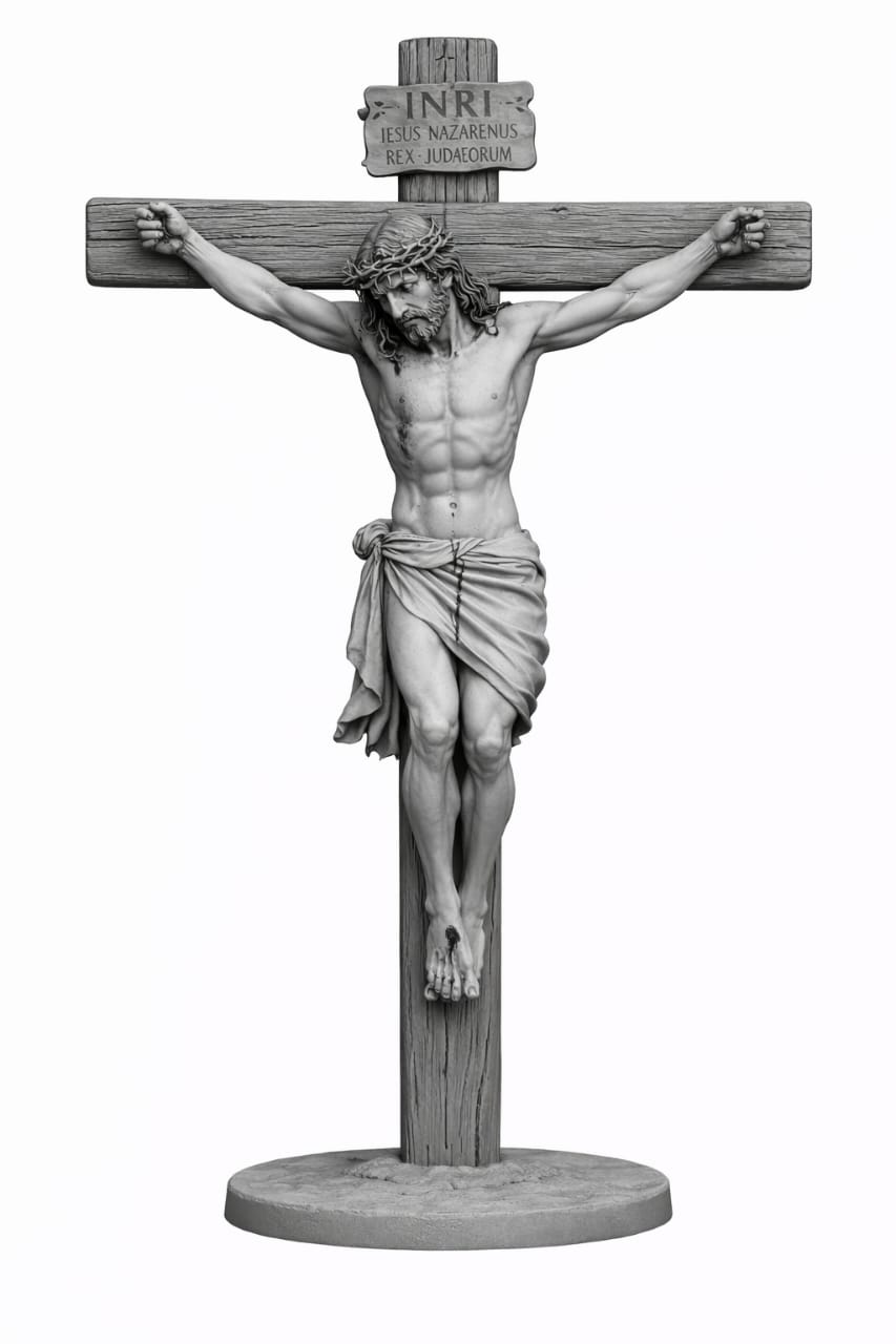 A imagem de Jesus Cristo na cruz carrega um silêncio que fala alto… um instante suspenso entre dor e eternidade.